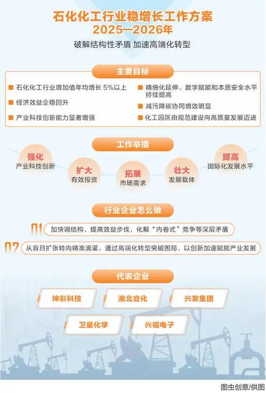 近日,工信部等七部门联合印发的《石化化工行业稳增长工作方案(2025—2026年)》(下称《工作方案》),提出了2025—2026年石化化工行业增加值年均增长5%以上,经济效益企稳回升,产业科技创新能力显著增强等目标。